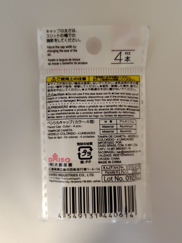 - ペンシルキャップ:4本 (110円・4本入り、100円ショップ等)