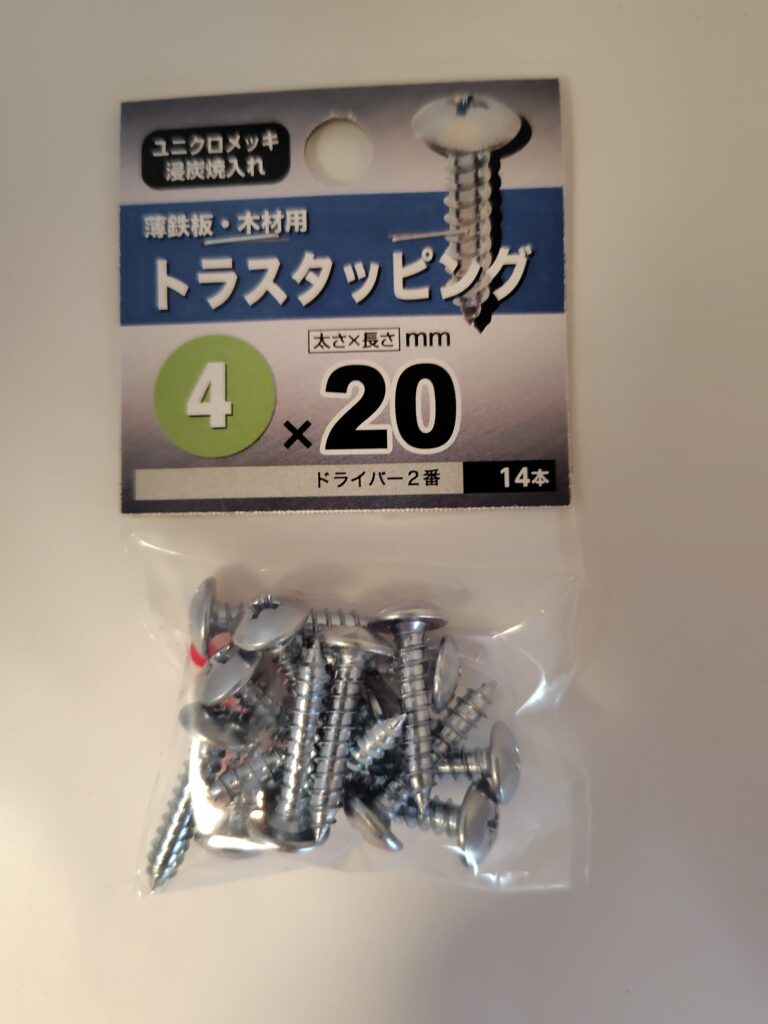 ※手持ちの端材でOK。好みで塗装しましょう。 - トラスタッピングネジ 4mm×20mm:4本 (200円・14本入り、ホームセンター等)